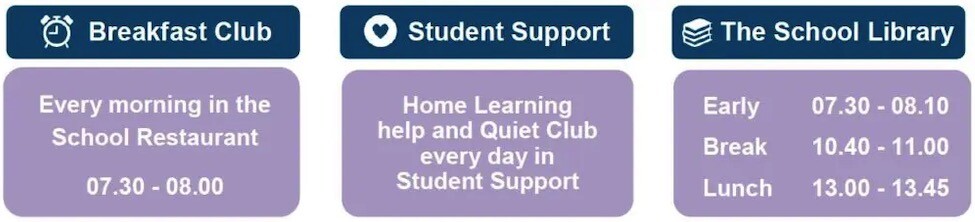 We deliver a comprehensive programme of Period 6 revision sessions to our Year 11 pupils, with some sessions delivered to Year 10 pupils. Our school library is open every morning at 7:30am for pupils as well as at break and lunch time. There is also a Breakfast Club in the School Restaurant 7:30-8:00 every day and a lunchtime Home Learning club in Student Support.