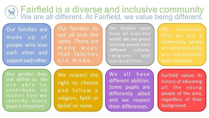 Fairfield staff receive regular training on equality and diversity and we are proud of our diverse and inclusive community. These are the messages we share within our school community and celebrate via assemblies, Heritage Days and tutor time.
